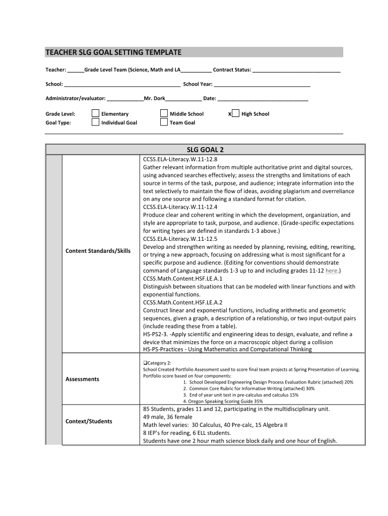 TEACHER SLG GOAL SETTING TEMPLATE Teacher: Grade Level Team (Science, Math and LA Contract Status: School: School Year: Administrator/evaluator: Mr. Dork Date: Grade Level: Elementary Middle School