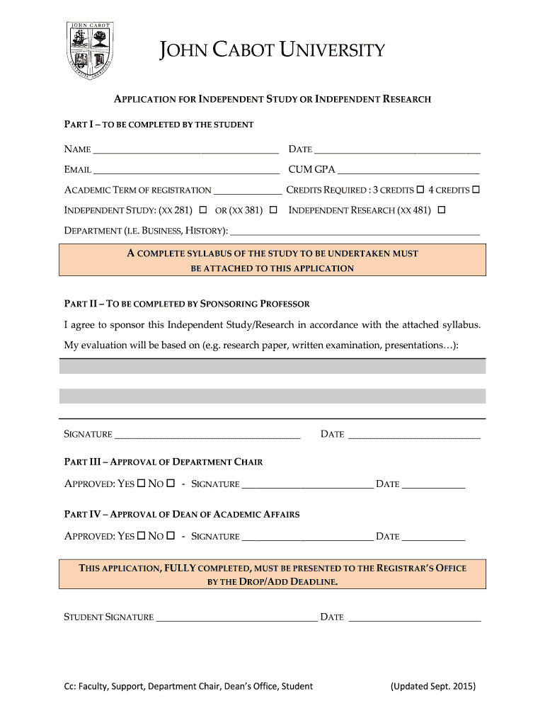 JOHN CABOT UNIVERSITY APPLICATION FOR INDEPENDENT STUDY OR INDEPENDENT RESEARCH PART I TO BE COMPLETED BY THE STUDENT NAME DATE EMAIL CUM GPA ACADEMIC TERM OF REGISTRATION CREDITS REQUIRED : 3 CREDITS