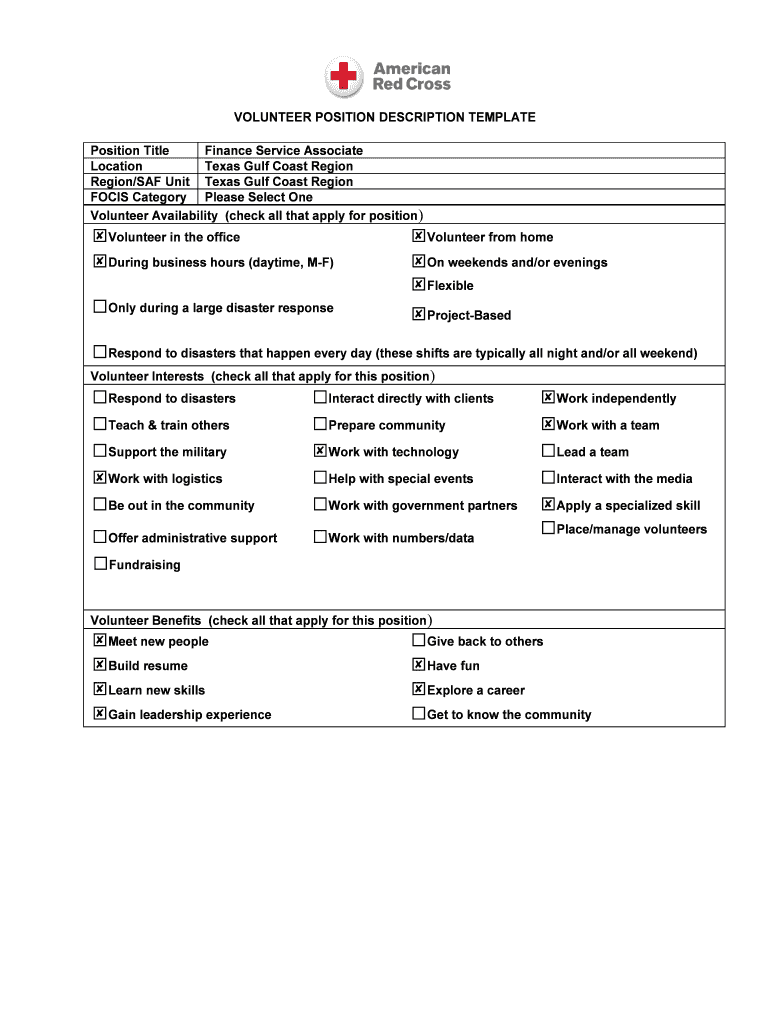 VOLUNTEER POSITION DESCRIPTION TEMPLATE Position Title Finance Service Associate Location Texas Gulf Coast Region/SAF Unit Texas Gulf Coast Region FOCUS Category Please Select One Volunteer Availability