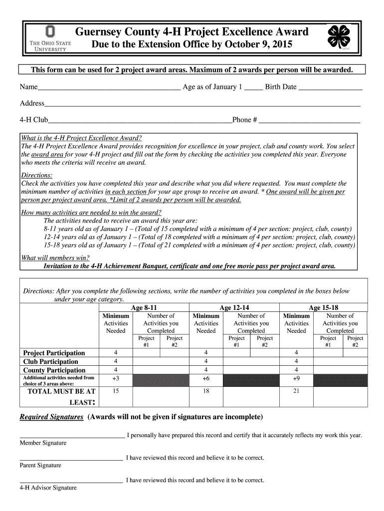 Guernsey County 4H Project Excellence Award Due to the Extension Office by October 9, 2015, This form can be used for 2 project award areas. Maximum of 2 awards per person will be awarded. Name Age