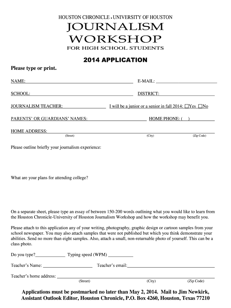 HOUSTON CHRONICLE UNIVERSITY OF HOUSTON JOURNALISM WORKSHOP FOR HIGH SCHOOL STUDENTS 2014 APPLICATION Please type or print. NAME: EMAIL: SCHOOL: DISTRICT: JOURNALISM TEACHER: I will be a junior or