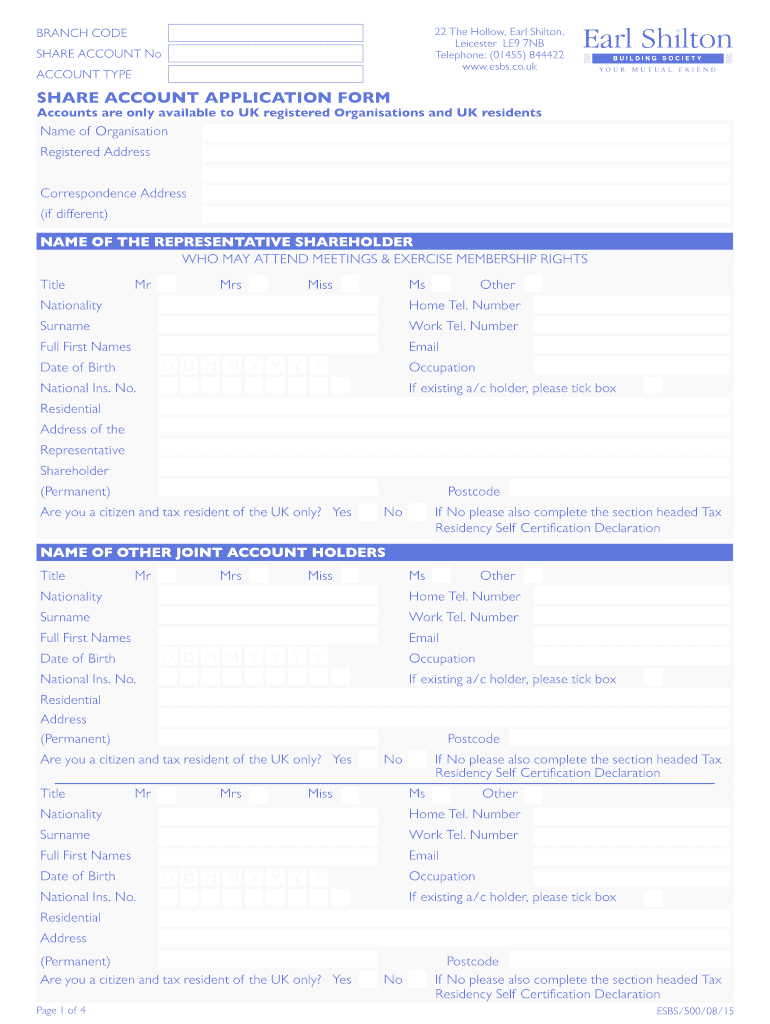 22 The Hollow, Earl Hilton, Leicester LE9 7NB Telephone: (01455) 844422 www.esbs.co.uk BRANCH CODE SHARE ACCOUNT No ACCOUNT TYPE SHARE ACCOUNT APPLICATION FORM Accounts are only available to UK registered