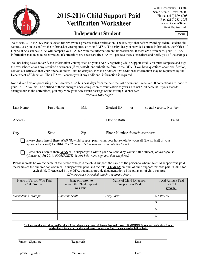 20152016 Child Support Paid Verification Worksheet 4301 Broadway CPO 308 San Antonio, Texas 78209 Phone: (210) 8296008 Fax: (210) 2835053 www.uiw.edu/finaid fin aid UIT.edu Independent Student CHI