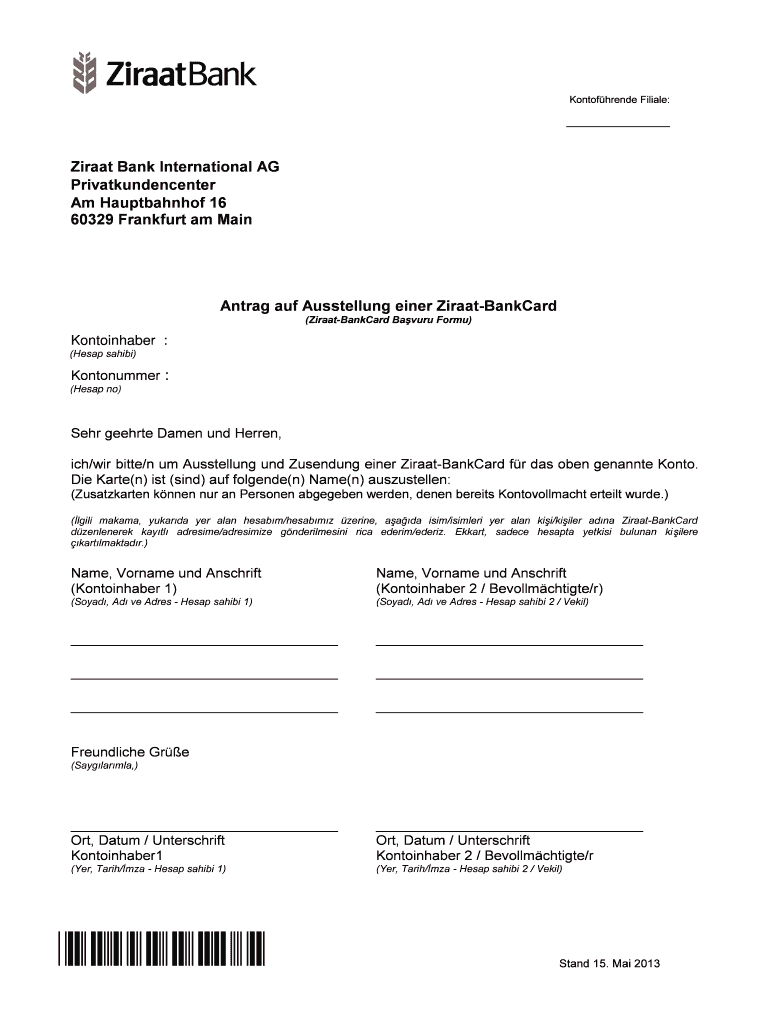 Laden Sie das Antragsformular von der Ziraat Bank International AG Website herunter.