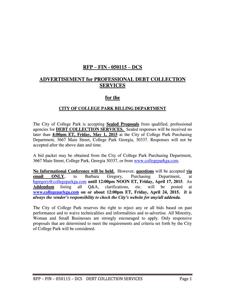 RFP FIN 050115 DCS ADVERTISEMENT for PROFESSIONAL DEBT COLLECTION SERVICES for the CITY OF COLLEGE PARK BILLING DEPARTMENT The City of College Park is accepting Sealed Proposals from qualified, professional
