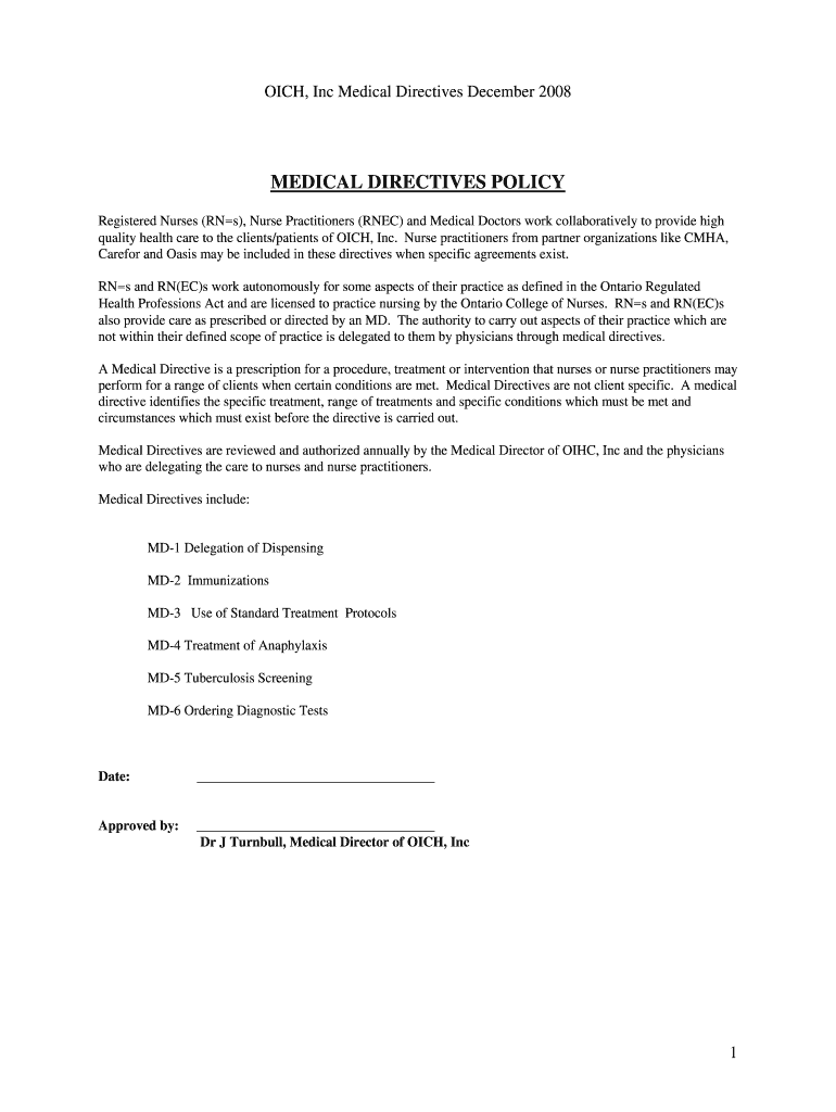 RICH, Inc Medical Directives December 2008 MEDICAL DIRECTIVES POLICY Registered Nurses (RN's), Nurse Practitioners (NEC) and Medical Doctors work collaboratively to provide high quality health care