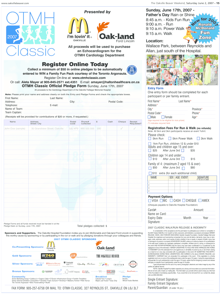 The Oakville Beaver Weekend, Saturday, June 2, 2007 15 www.oakvillebeaver.com N 07 Sunday, June 17th, 2007 Father's Day Rain or Shine for 20 8:45 a.m. Kids Fun Run w e Ronald 9:00 a.m. Run McDonald