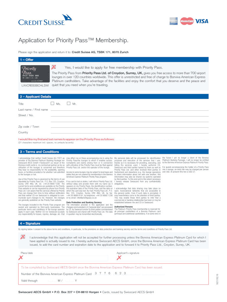 GmbH Application for Priority Pass Membership. Please sign the application and return it to: Credit Suisse AG, SBK 171, 8070 Zurich 1 Offer Yes, I would like to apply for free membership with Priority