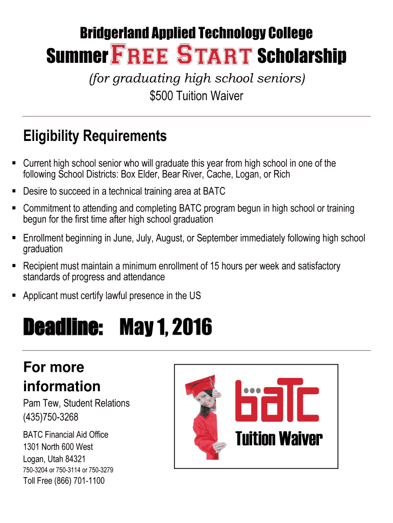 Bridger land Applied Technology College Summer Scholarship (for graduating from high school seniors) $500 Tuition Waiver Eligibility Requirements Current high school senior who will graduate this