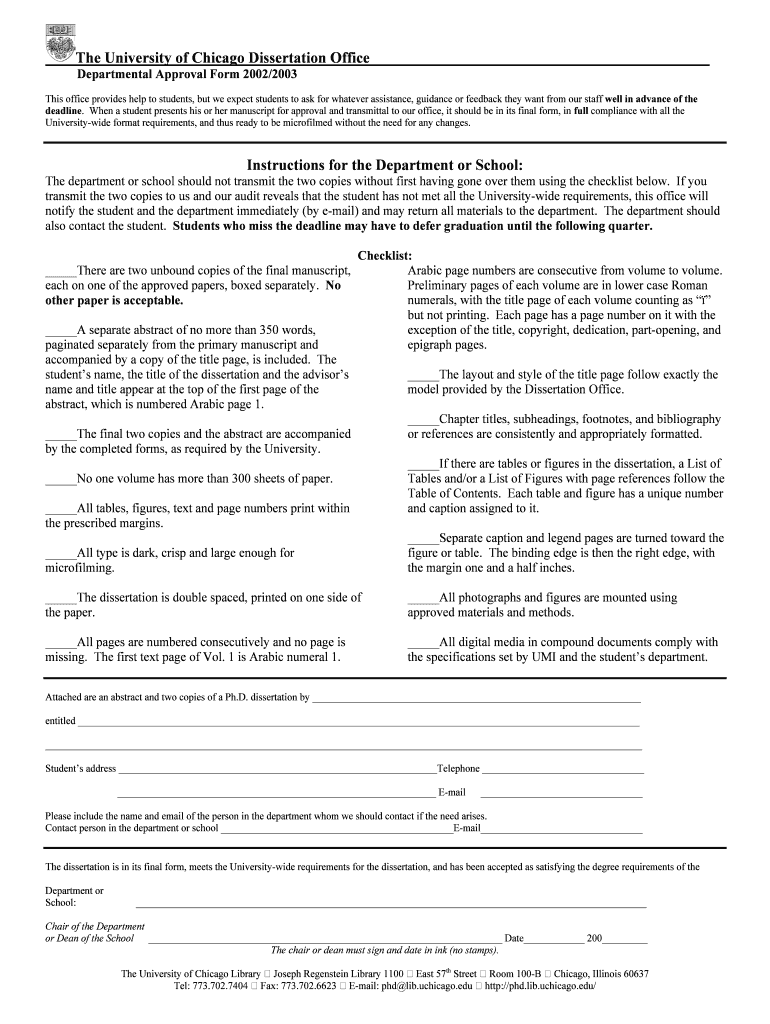 The University of Chicago Dissertation Office Departmental Approval Form 2002/2003 This office provides help to students, but we expect students to ask for whatever assistance, guidance or feedback