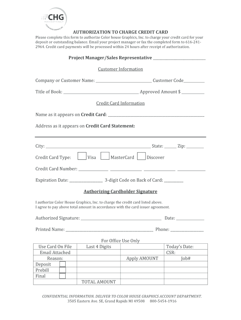 CHG FROM CONCEPT TO REALITY C O L O R H O USE GRA P H I C S, I N C. AUTHORIZATION TO CHARGE CREDIT CARD Please complete this form to authorize