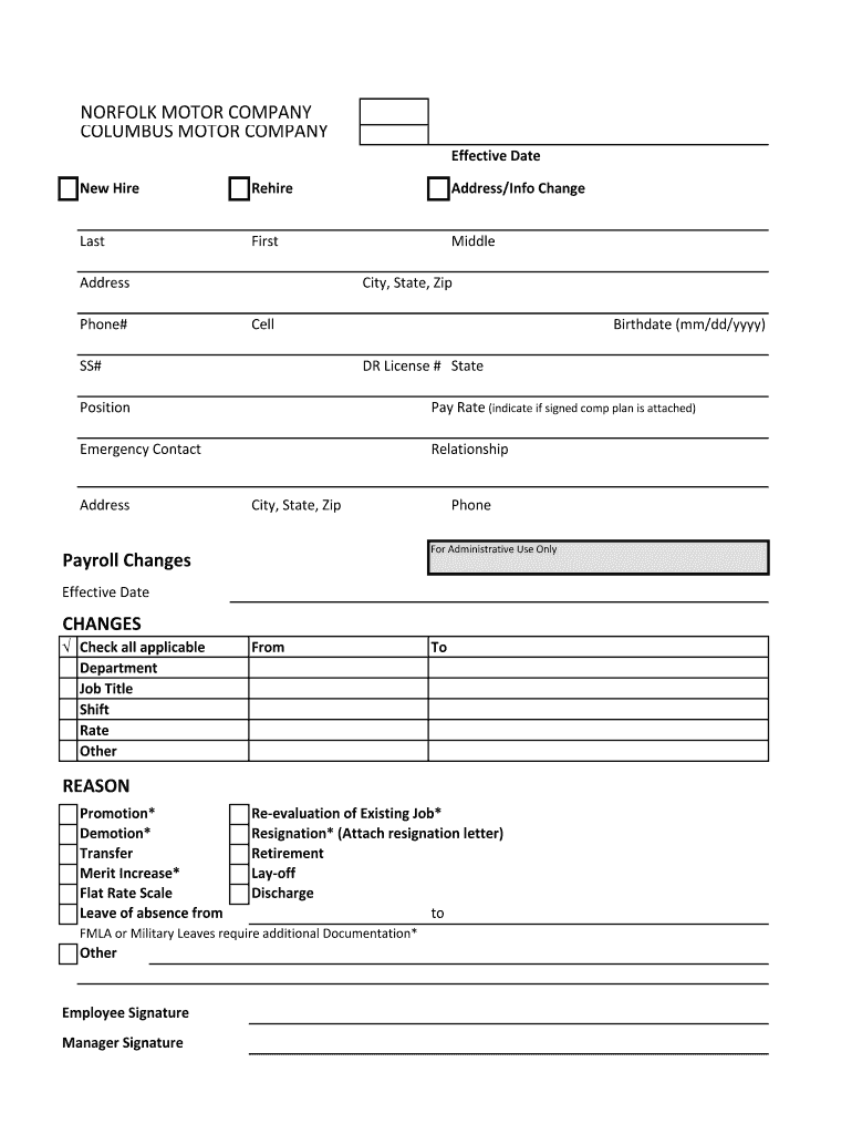 NORFOLK MOTOR COMPANY COLUMBUS MOTOR COMPANY Effective Date New Hire Rehire Address/Info Change Last First Middle Address City, State, Zip Phone# Cell Birthdate (mm ...