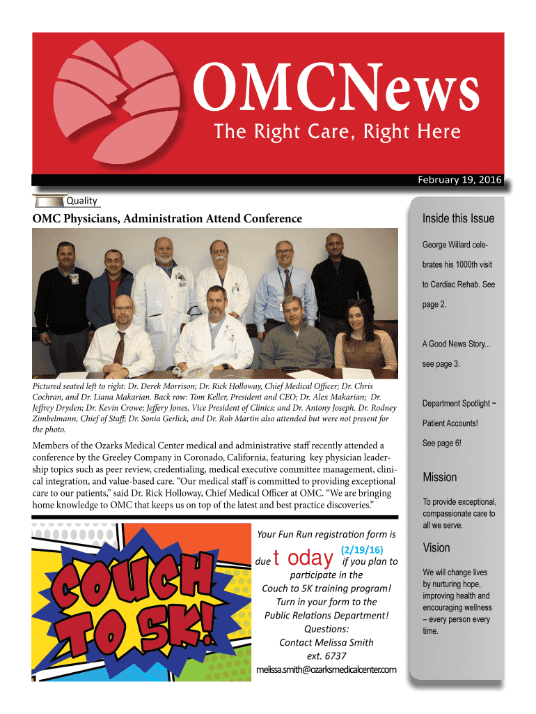 News The Right Care, Right Here February 19, 2016, Quality OMC Physicians, Administration Attend Conference Inside this Issue George Willard celebrates his 1000th visit to Cardiac Rehab. See page