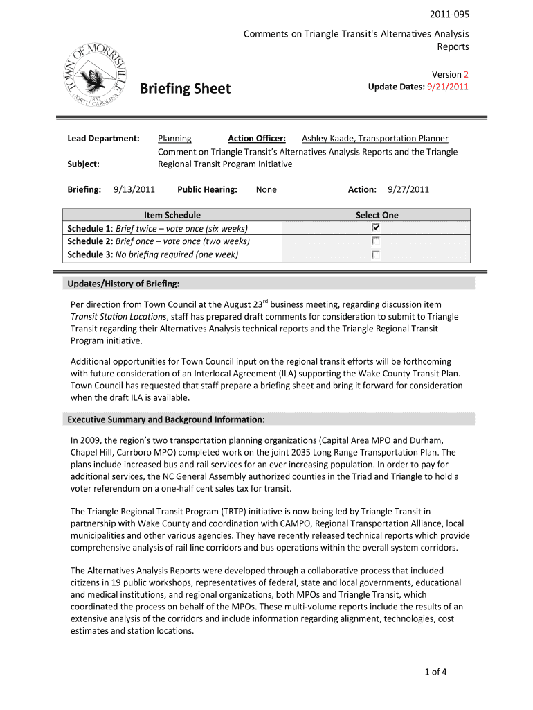 2011095 Comments on Triangle Transit's Alternatives Analysis Reports Version 2 Update Dates: 9/21/2011 Briefing Sheet Lead Department: Subject: Briefing: 9/13/2011 Planning Action Officer: Ashley