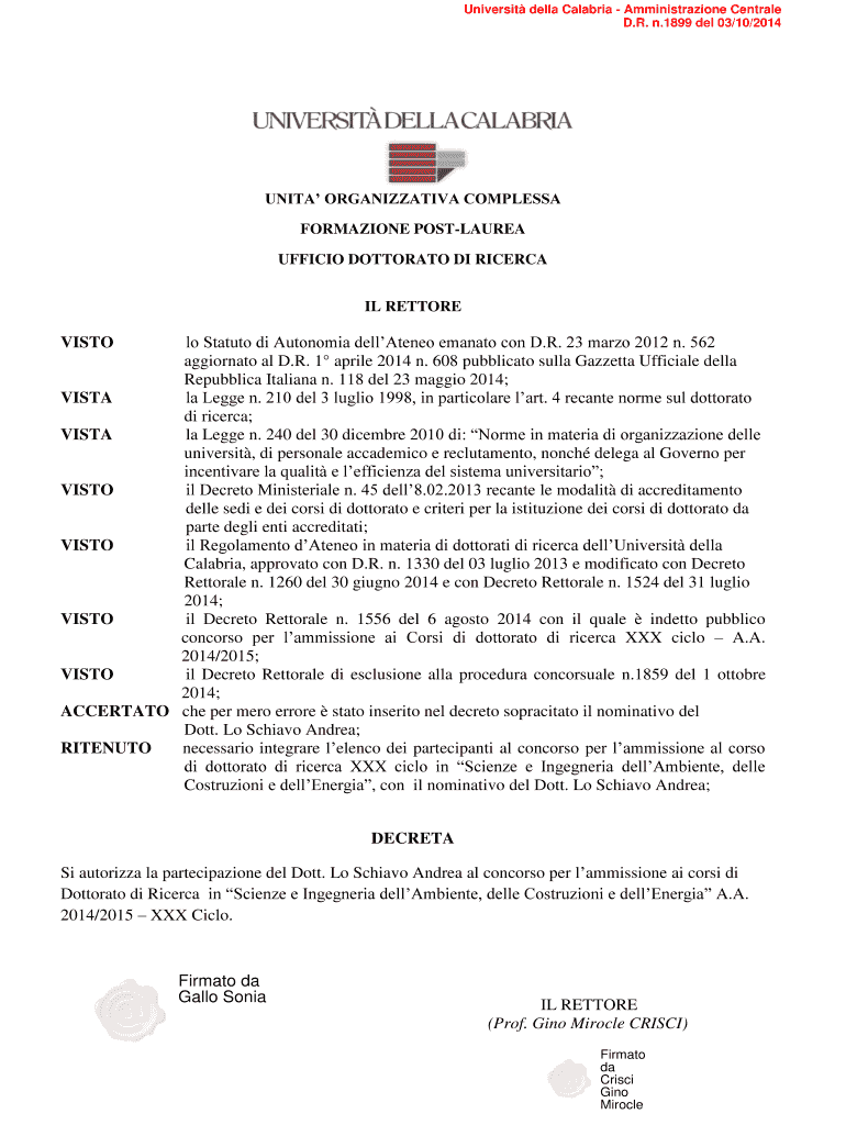 University Della Calabria Administration Central D.R. n.1899 Del 03/10/2014 UNITS ORGANIZATION COMPRESS FORMATION POSTURE OFFICE DOCTORATE DI RICE RCA IL RESTORE lo Statute DI Autonomic dellAteneo