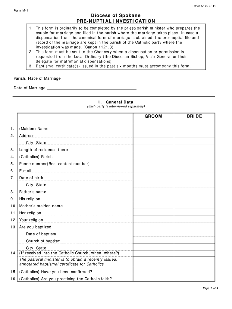 Revised 6/2012 Form M1 Diocese of Spokane PRENUPTIAL INVESTIGATION 1. This form is ordinarily to be completed by the priest/parish minister who prepares the couple for marriage and filed in the parish