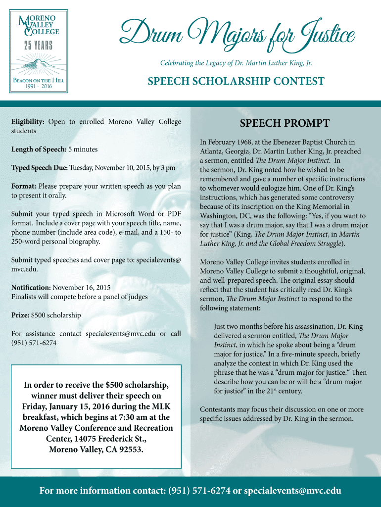 Drum Majors for Justice Celebrating the Legacy of Dr. Martin Luther King, Jr. SPEECH SCHOLARSHIP CONTEST Eligibility: Open to enrolled Moreno Valley College students Length of Speech: 5 minutes Typed