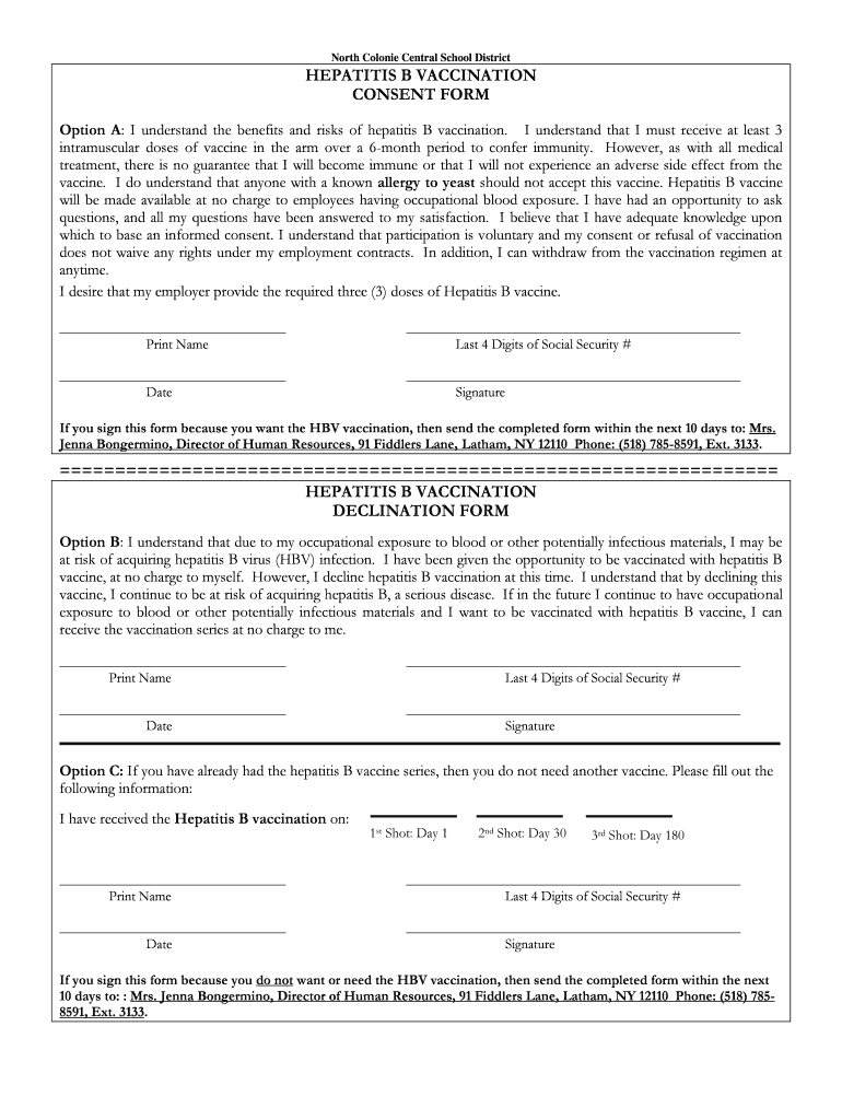 North Colonies Central School District HEPATITIS B VACCINATION CONSENT FORM Option A: I understand the benefits and risks of hepatitis B vaccination. I understand that I must receive at least 3 intramuscular