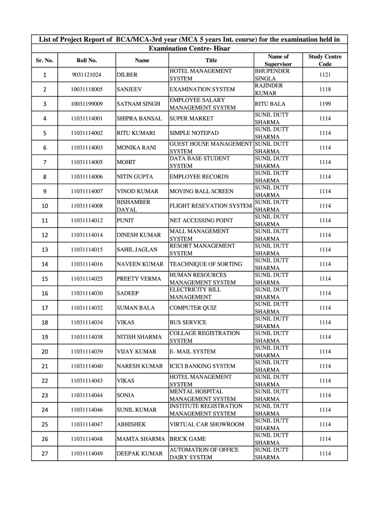 List of Project Report of BCA/MCA3rd year (MCA 5 years Int. Course) for the examination held in