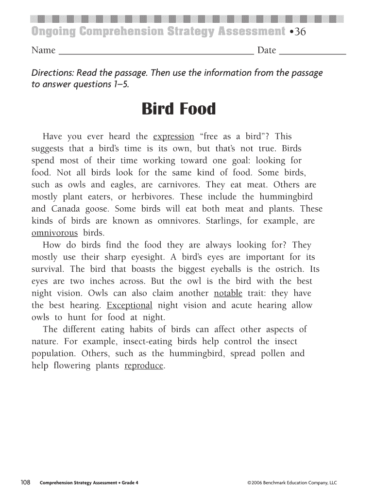 Ongoing Comprehension Strategy Assessment 36 Name Date Directions: Read the passage. Then use the information from the passage to answer questions 15. Bird Food Have you ever heard the expression