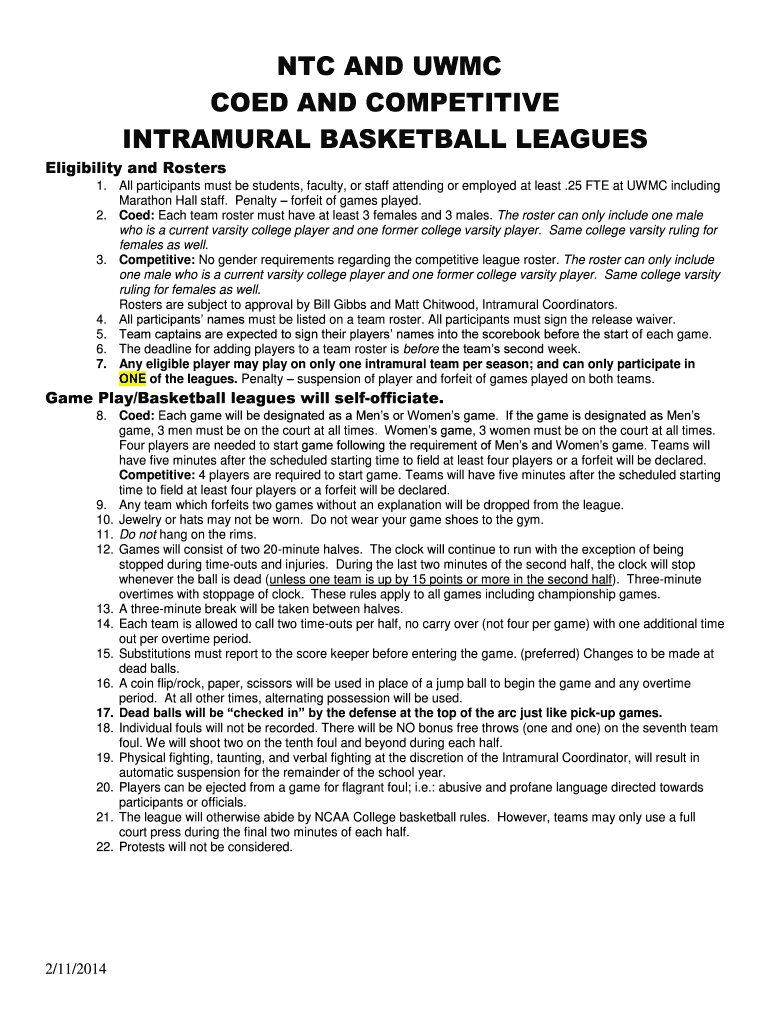 NTC AND USMC COED AND COMPETITIVE INTRAMURAL BASKETBALL LEAGUES Eligibility and Rosters 1. All participants must be students, faculty, or staff attending or employed at least .25 FTE at USMC including