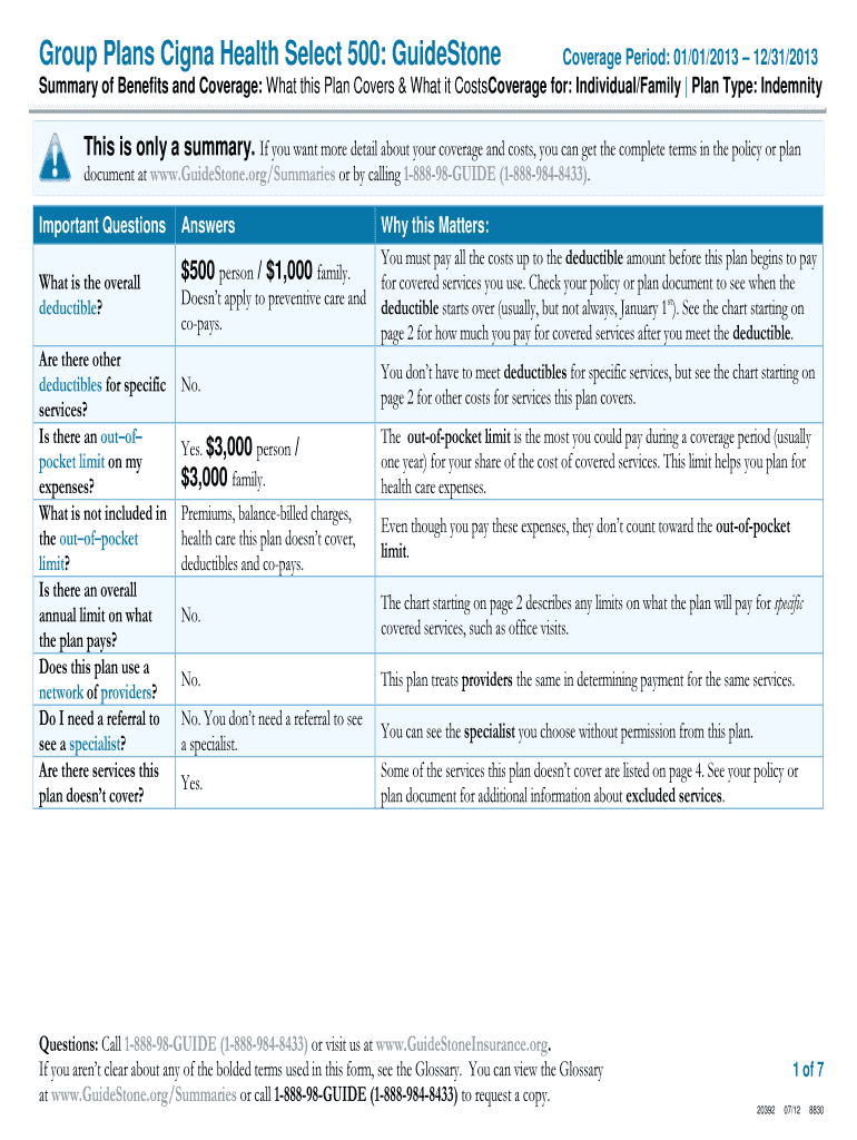 Group Plans Cagney Health Select 500: GuideStoneCoverage Period: 01/01/2013 12/31/2013 Summary of Benefits and Coverage: What this Plan Covers & What it CostsCoverage for: Individual/Family Plan Type:
