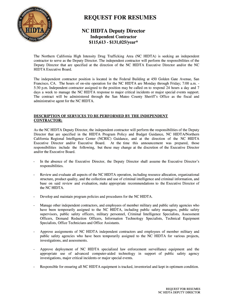 REQUEST FOR RESUMES NC HI DTA Deputy Director Independent Contractor $$115,613131,025/year* The Northern California High Intensity Drug Trafficking Area (NC HI DTA) is seeking an independent contractor
