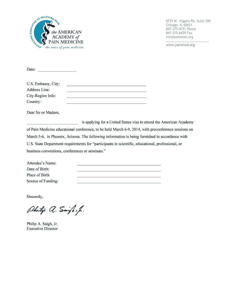 8735 W. Higgins Rd, Suite 300 Chicago, IL 60631 8473754731 Phone 8473756429 Fax info painted.org ................................... www.painmed.org Date: U.S. Embassy, City: Address Line: Bioregion