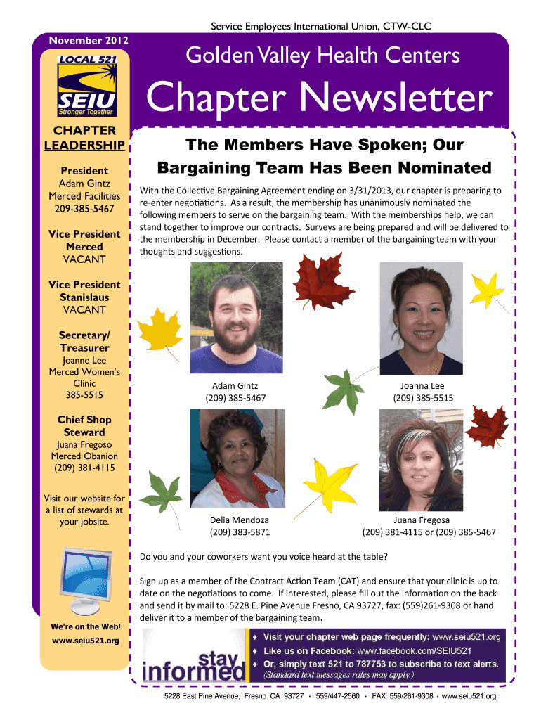 Service Employees International Union, CYCLE November 2012 Golden Valley Health Centers Chapter Newsletter CHAPTER LEADERSHIP President Adam Into Merced Facilities 2093855467 Vice President Merced
