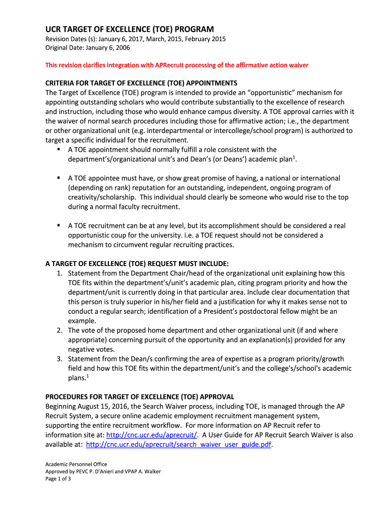UCR TARGET OF EXCELLENCE (TOE) PROGRAM