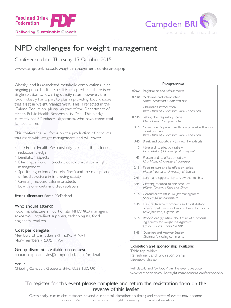 NPD challenges for weight management Conference date: Thursday 15 October 2015 www.campdenbri.co.uk/weightmanagementconference.php Obesity, and its associated metabolic complications, is an ongoing