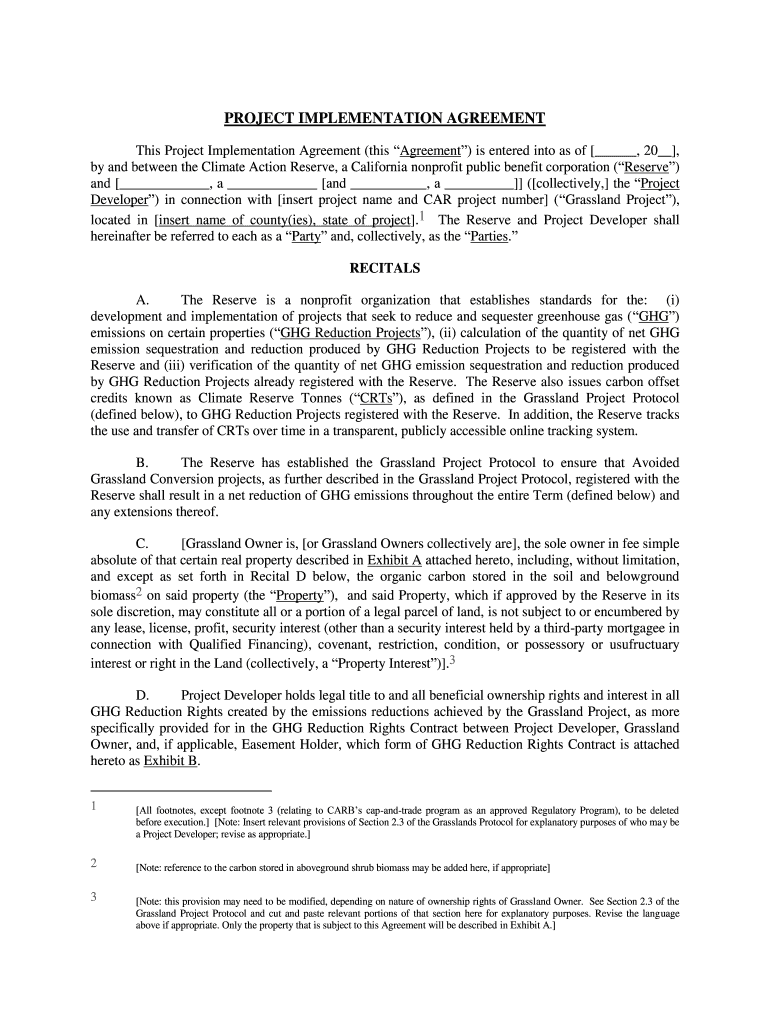 PROJECT IMPLEMENTATION AGREEMENT This Project Implementation Agreement (this Agreement) is entered into as of, 20, by and between the Climate Action Reserve, a California nonprofit public benefit