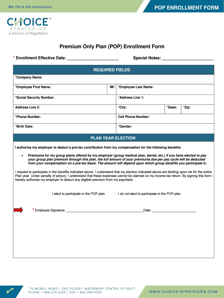 POP ENROLLMENT FORM POP ENROLLMENT FORM Premium Only Plan (POP) Enrollment Form * Enrollment Effective Date: Special Notes: * REQUIRED FIELDS * *Company Name: *Employee First Name: MI: *Employee Last