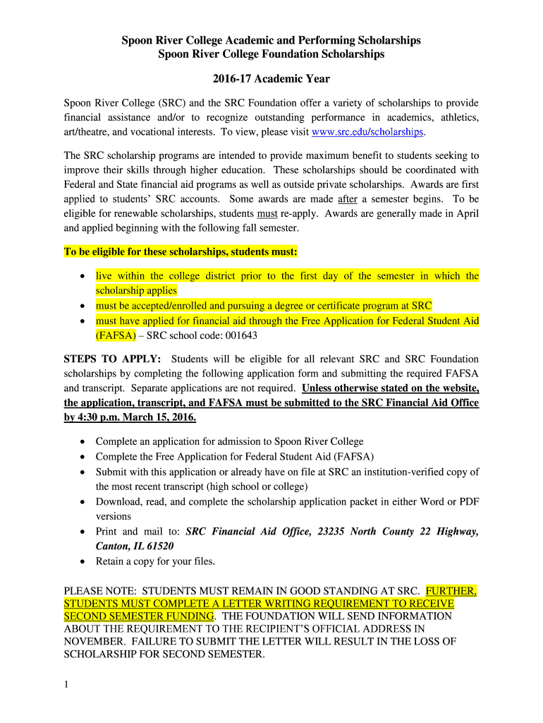 Spoon River College Academic and Performing Scholarships Spoon River College Foundation Scholarships 2016-17 Academic Year Spoon River College (SRC) and the SRC Foundation offer a variety of scholarships