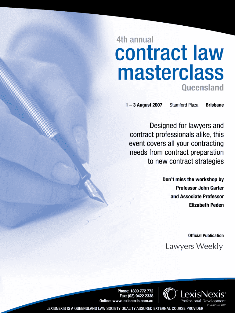 4th annual contract law masterclass Queensland 1 3 August 2007 Stamford Plaza Brisbane Designed for lawyers and contract professionals alike, this event covers all your contracting needs from contract