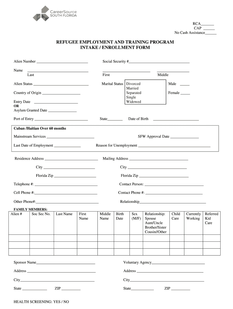 RCA CAP No Cash Assistance REFUGEE EMPLOYMENT AND TRAINING PROGRAM INTAKE / ENROLLMENT FORM Alien Number Social Security # Name First Last Alien Status Middle Marital Status Divorced Married Separated