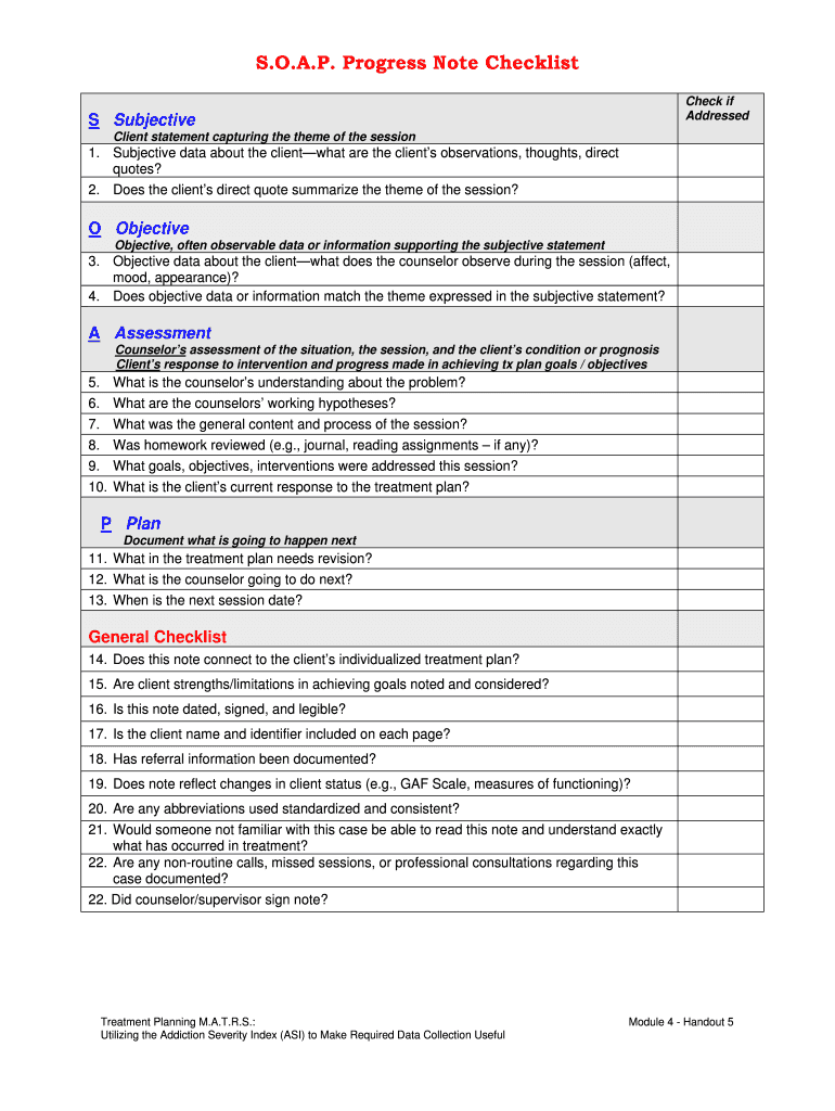 S.O.A.P. Progress Note Checklist