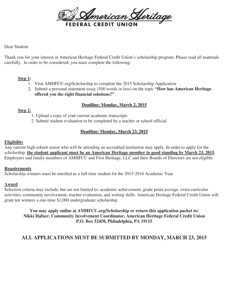 Dear Student: Thank you for your interest in American Heritage Federal Credit Unions scholarship program. Please read all materials carefully. In order to be considered, you must complete the following: