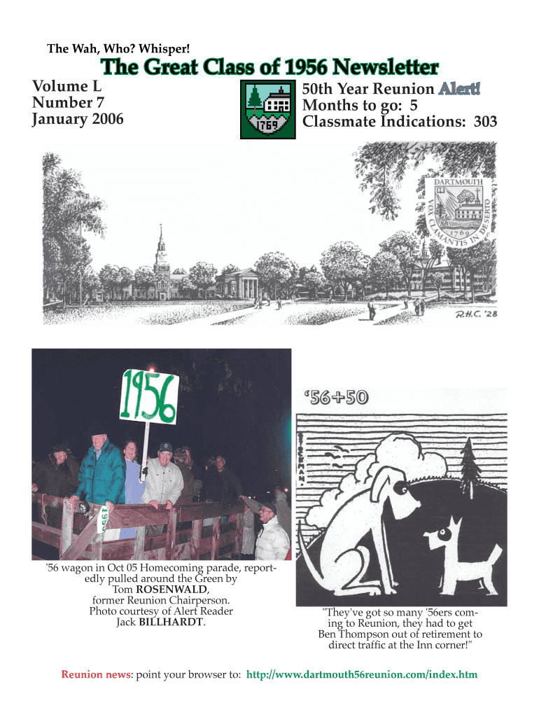 The Was, Who? Whisper! The Great Class of 1956 Newsletter Volume L Number 7 January 2006 '56 wagons in Oct 05 Homecoming parade, reportedly pulled around the Green by Tom ROSENWALD, former Reunion