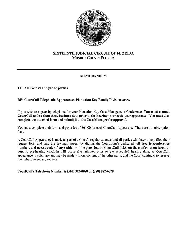 SIXTEENTH JUDICIAL CIRCUIT OF FLORIDA MONROE COUNTY FLORIDA MEMORANDUM TO: All Counsel and pro SE parties RE: Outcall Telephonic Appearances Plantation Key Family Division cases. If you wish to appear