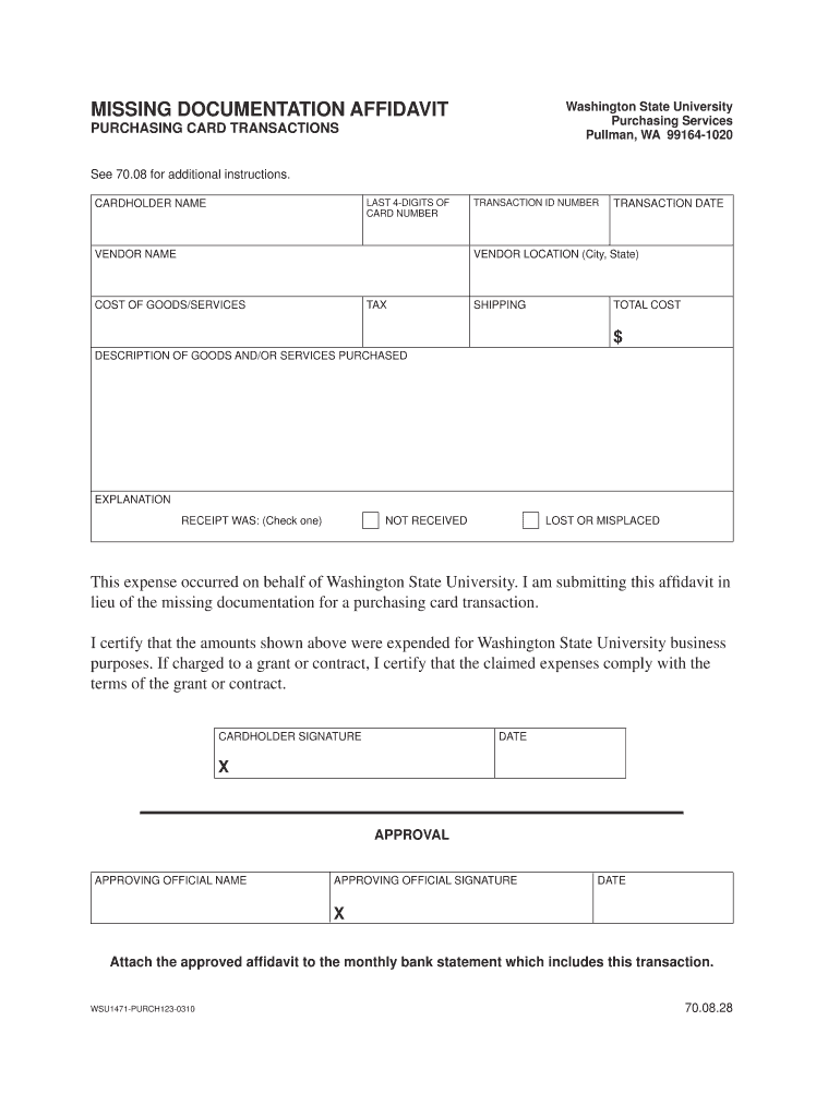 Washington State University Purchasing Services Pullman, WA 991641020 MISSING DOCUMENTATION AFFIDAVIT PURCHASING CARD TRANSACTIONS See 70.08 for additional instructions. LAST 4DIGITS OF CARD NUMBER