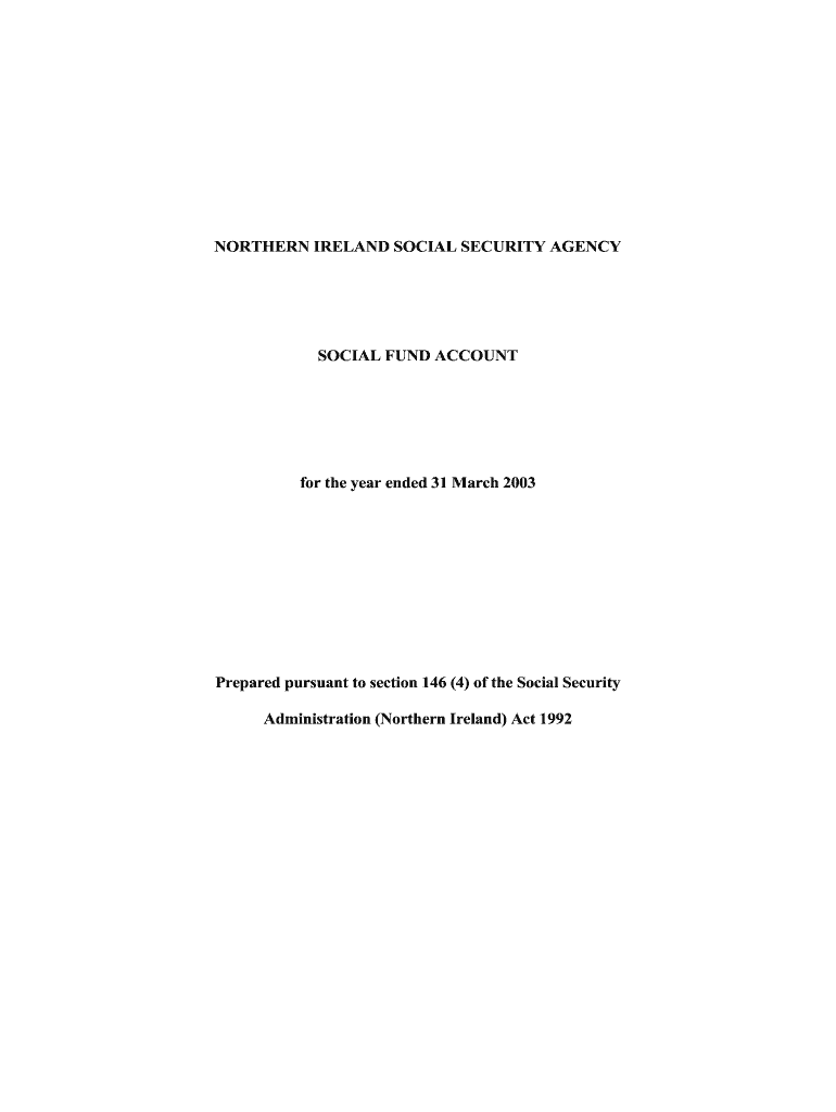 Organizations and entities that manage and disburse funds under the Northern Ireland Social Fund are required to file the Northern Ireland Social Fund Account 2002/03.