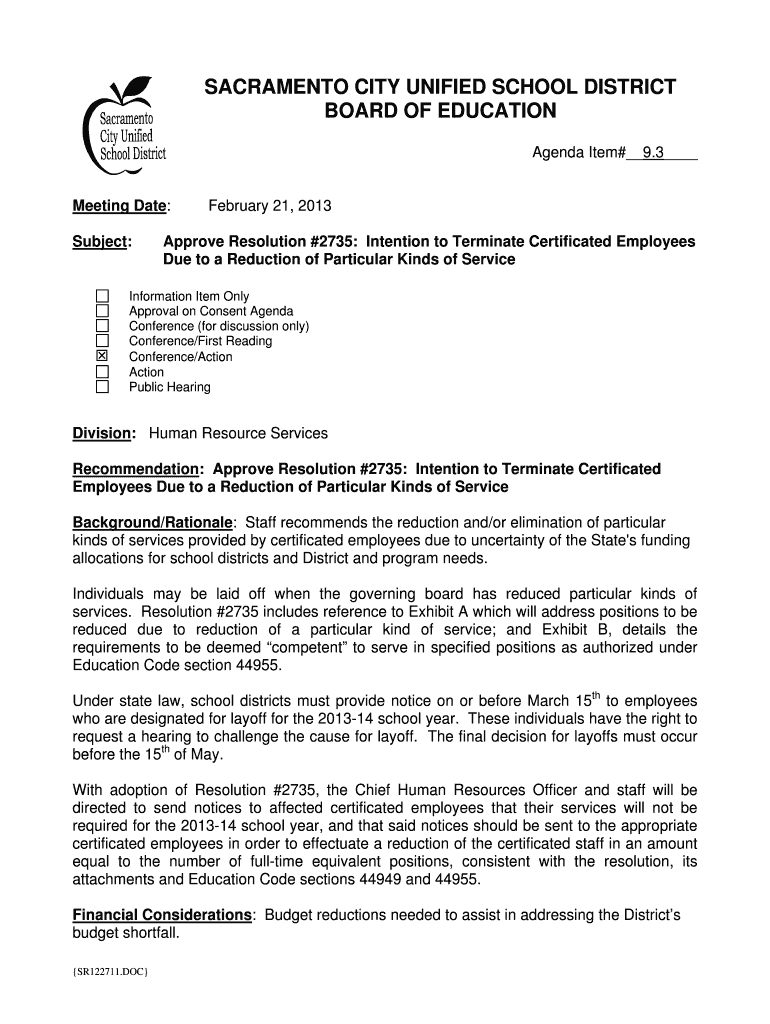 Get the free Approve Resolution #2735 Intention to Terminate Certificated Employees