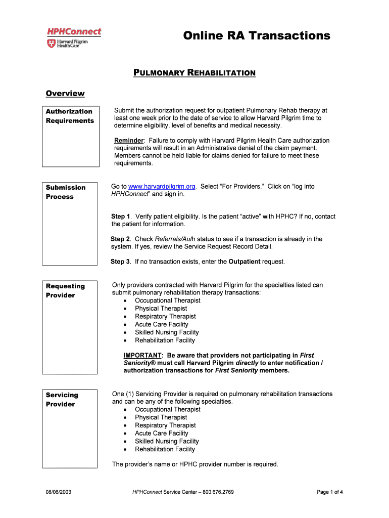 Get the free PULMONARY REHABILITATION - Harvard Pilgrim
