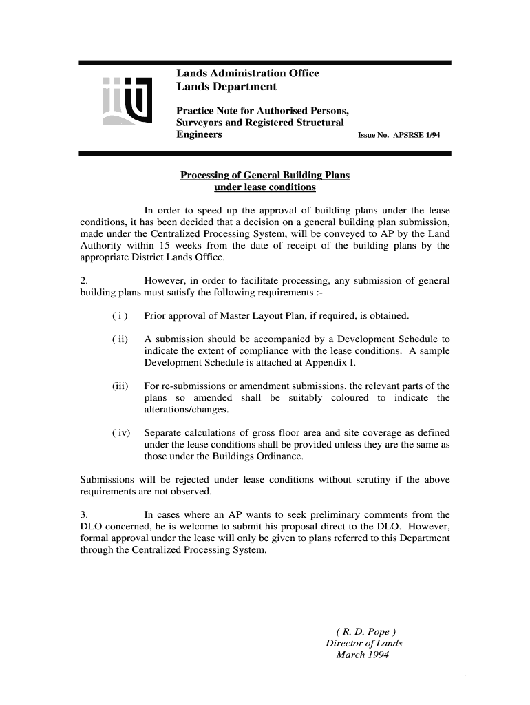 Lands Administration Office Lands Department Practice Note for Authorized Persons, Surveyors and Registered Structural Engineers Issue No. APS RSE 1/94 Processing of General Building Plans under lease