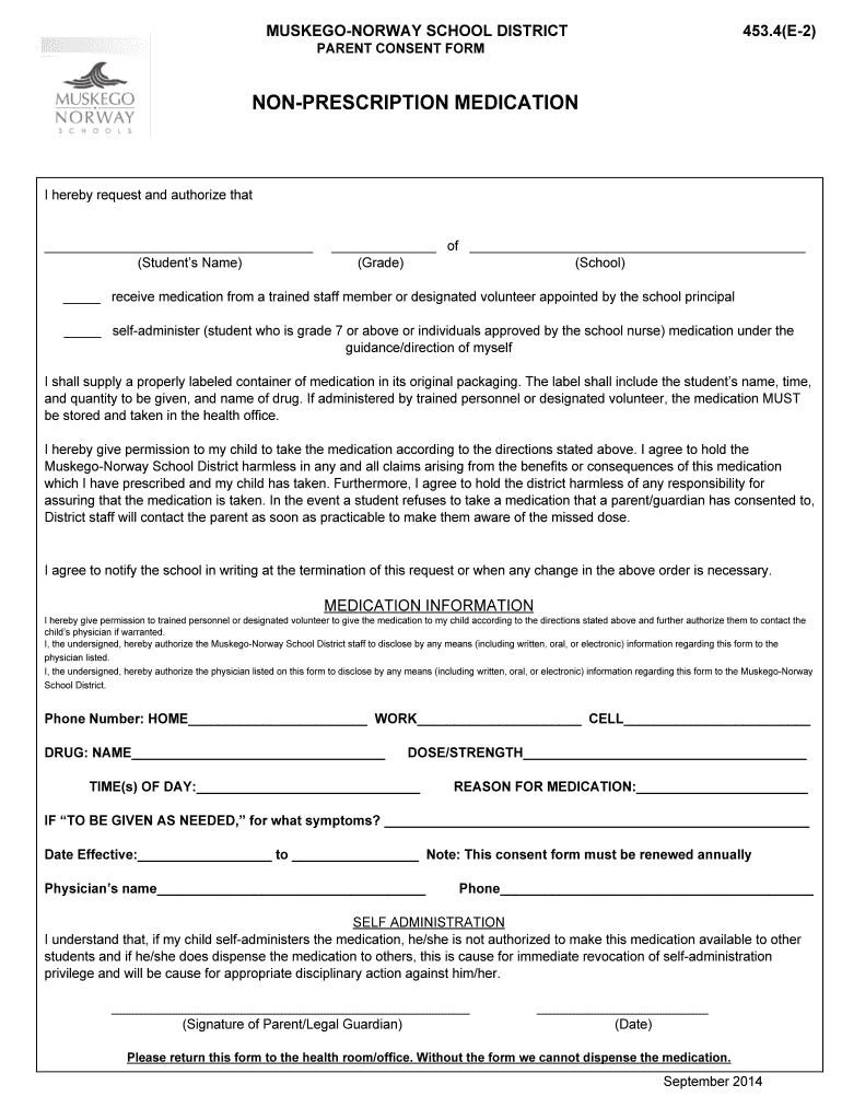 MUSKEGON NORWAY SCHOOL DISTRICT PARENT CONSENT FORM NON-PRESCRIPTION MEDICATION 453.4(E 2) I hereby request and authorize that of (Student s Name) (Grade) (School) receive medication from a trained