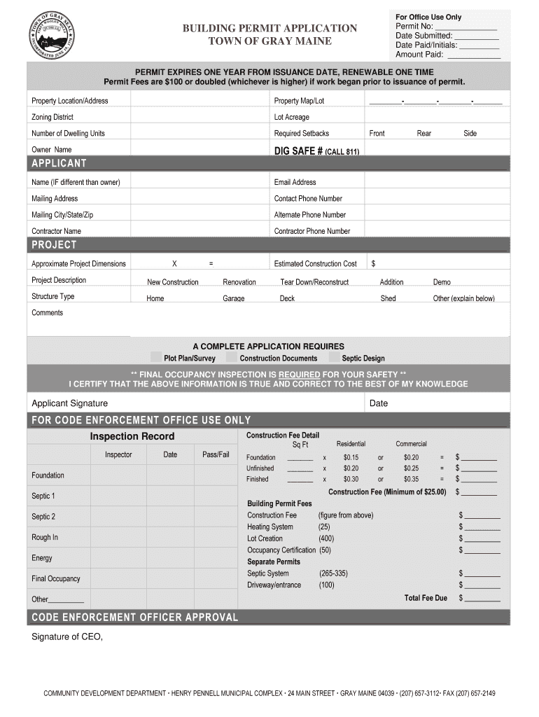 For Office Use Only Permit No: Date Submitted: Date Paid/Initials: Amount Paid: BUILDING PERMIT APPLICATION TOWN OF GRAY MAINE PERMIT EXPIRES ONE YEAR FROM ISSUANCE DATE, RENEWABLE ONE TIME Permit