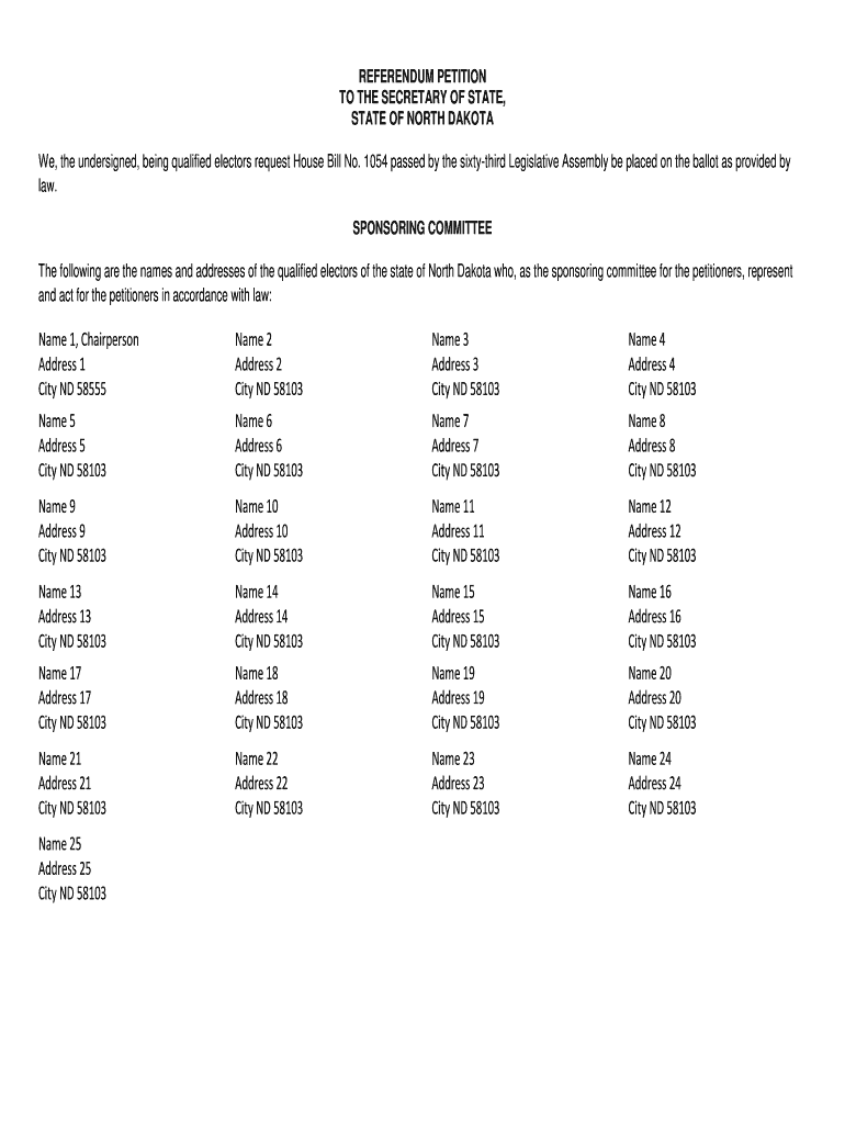 REFERENDUM PETITION TO THE SECRETARY OF STATE, STATE OF NORTH DAKOTA We, the undersigned, being qualified electors request House Bill No. 1054 passed by the sixty-third Legislative Assembly be placed