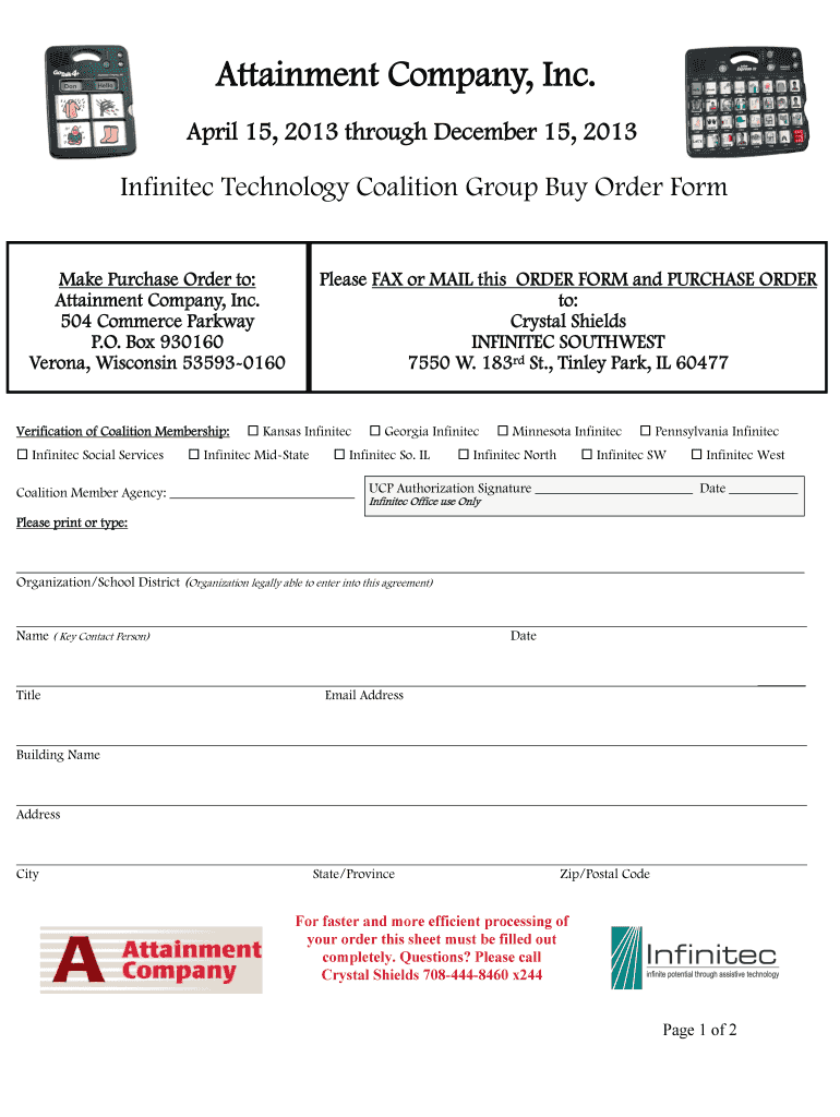 Attainment Company, Inc. April 15, 2013, through December 15, 2013, Infinite Technology Coalition Group Buy Order Form Make Purchase Order to: Attainment Company, Inc. 504 Commerce Parkway P.O. Box