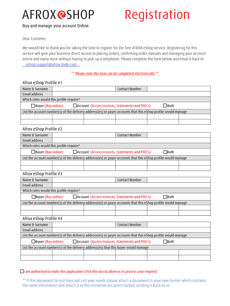 Buy and manage your account Online Dear Customer, We would like to thank you for taking the time to register for the free AFRO shop service. Registering for this service will give your business direct